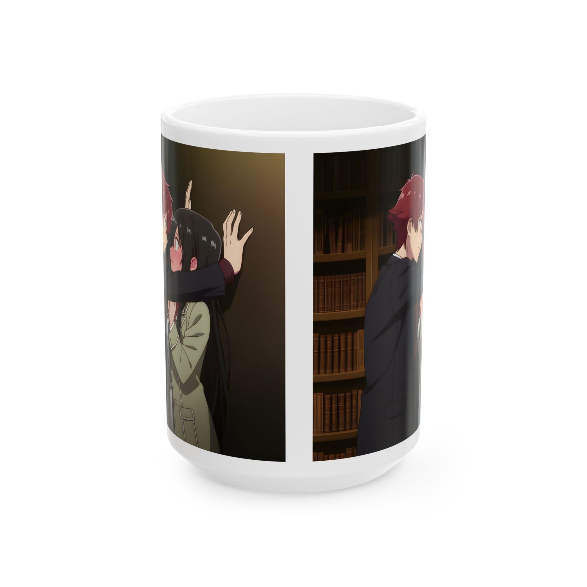 Anime Romance Mug – Heart-Stopping Kabe-Don Scene, Blushing Library Moment, Cute Couple Coffee Cup
