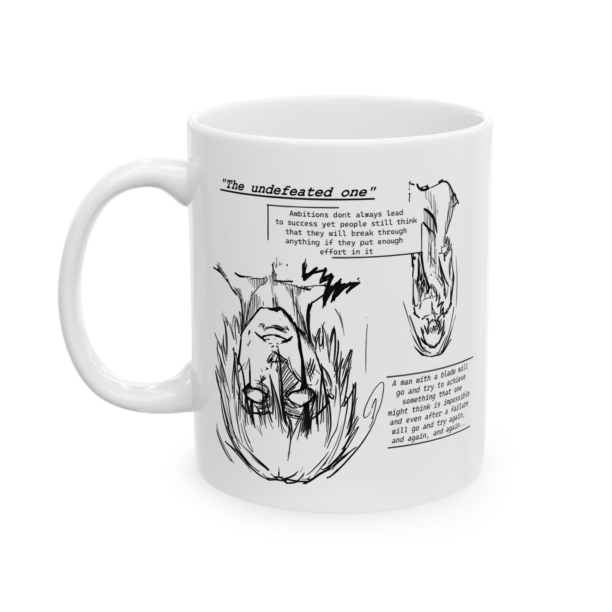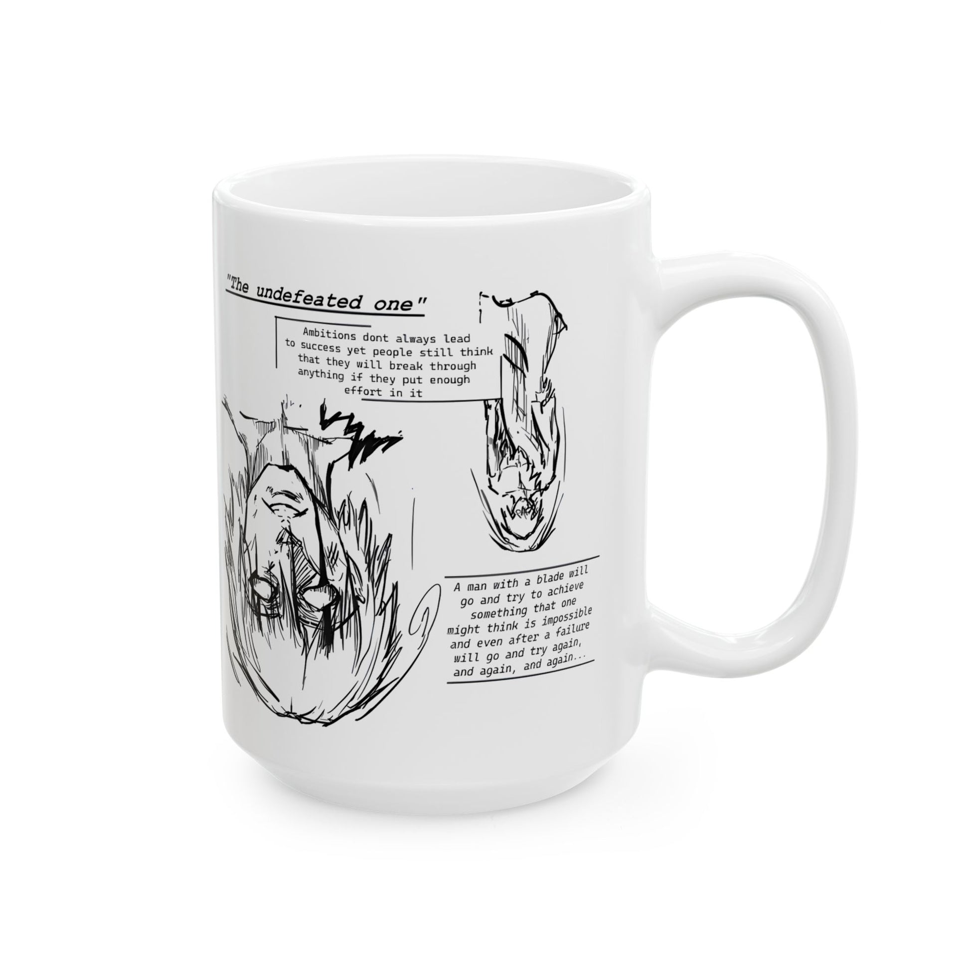 Cross-Eyed Samurai Mug – Fall of the Undefeated, Hand-Drawn Manga Art Coffee Cup, Mythic Anime Gift for Fans of Gritty Stories, B&W Samurai Design