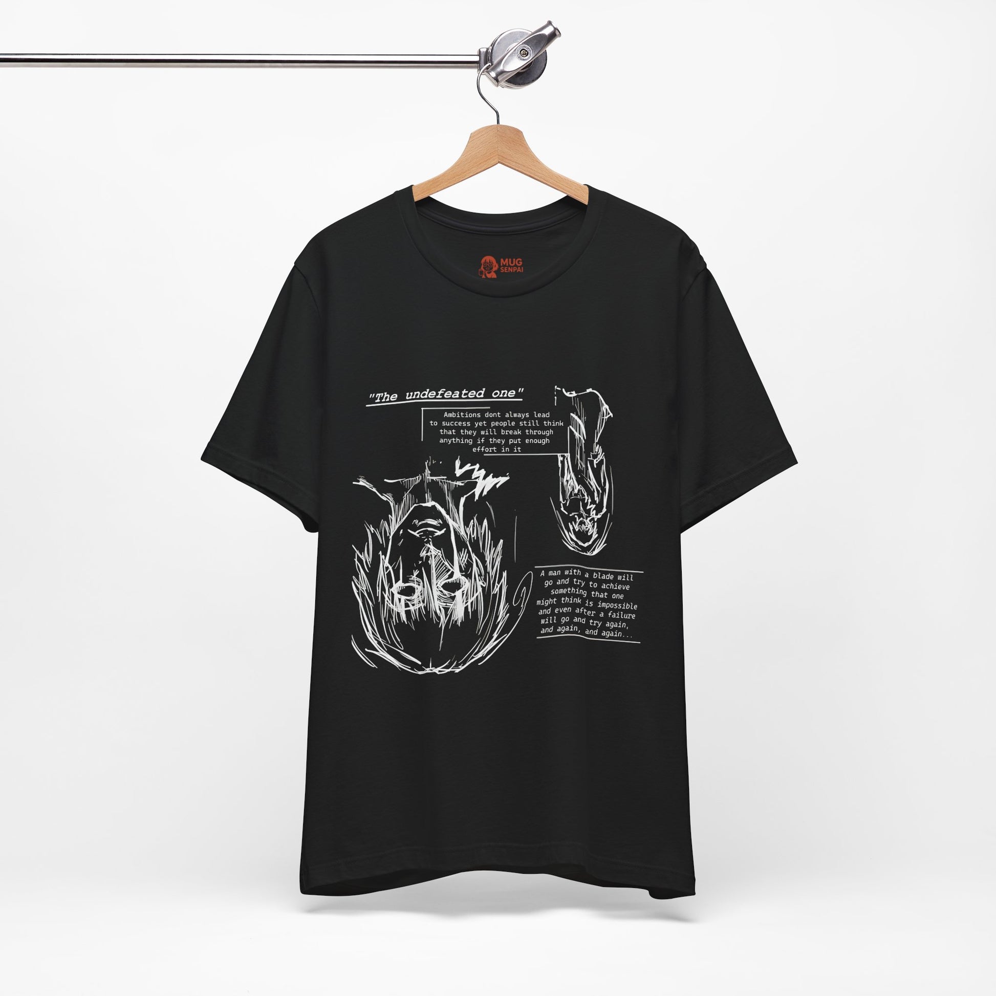 Cross-Eyed Samurai T-Shirt – Fall of the Undefeated, Hand-Drawn Manga Art Tee, Mythic Anime Shirt, Black & White Samurai Graphic for Fans