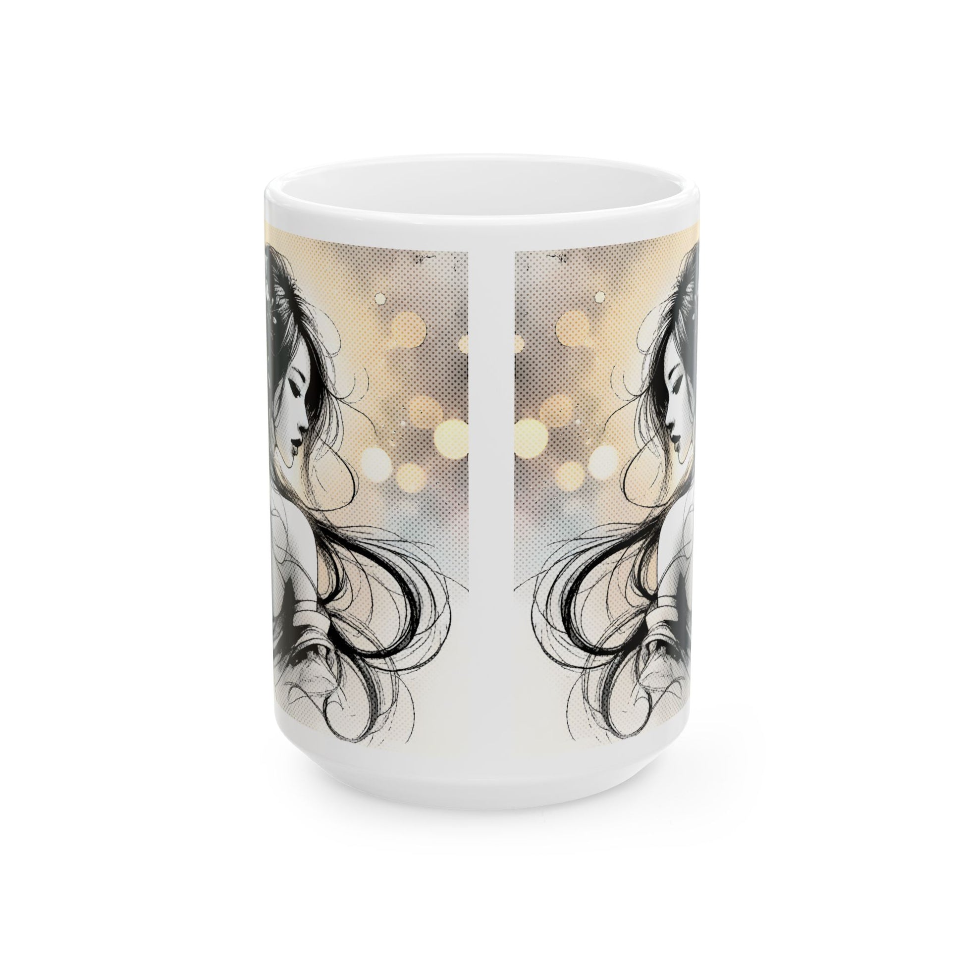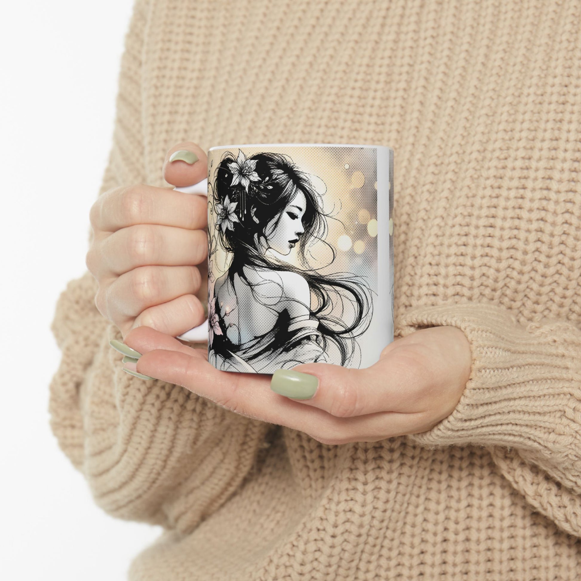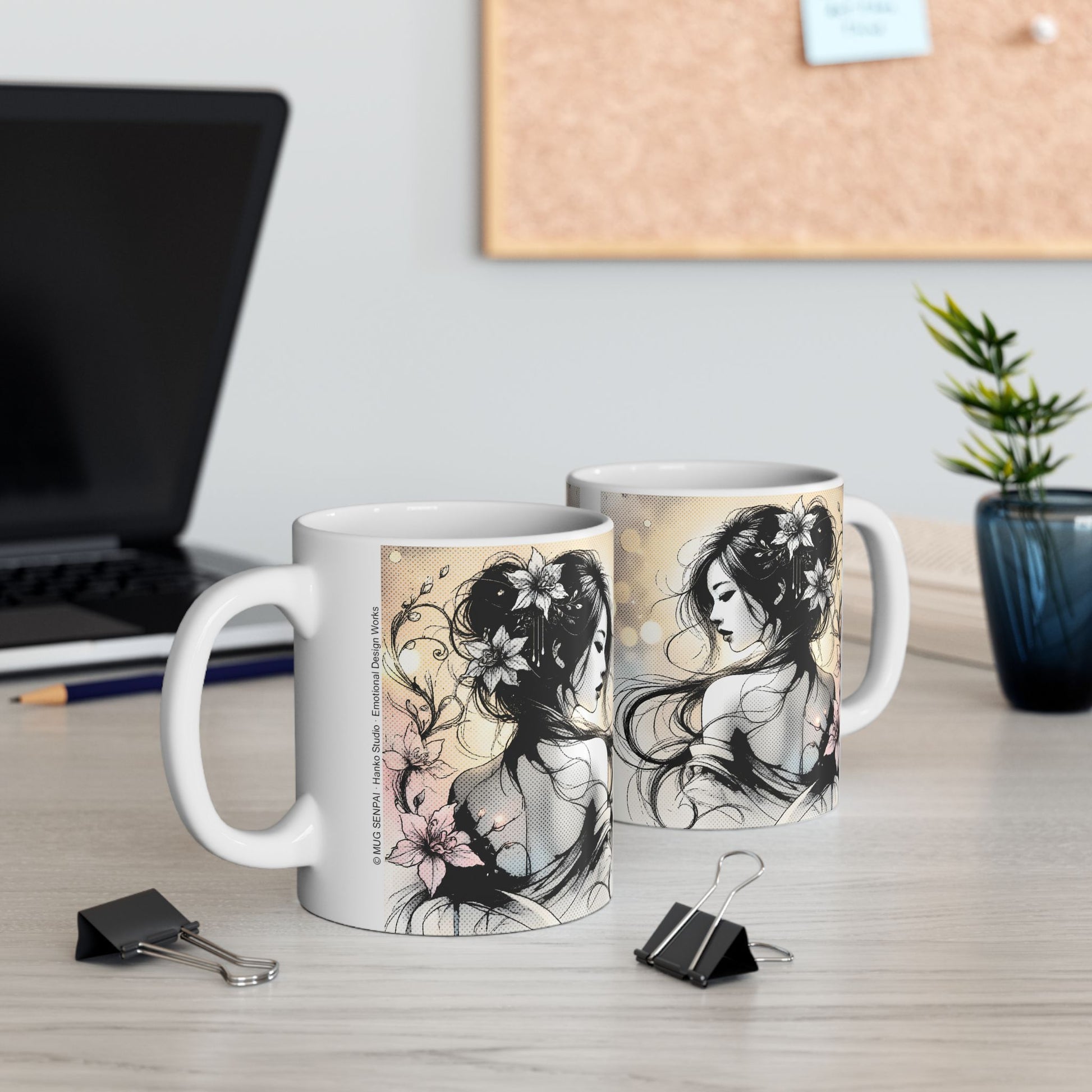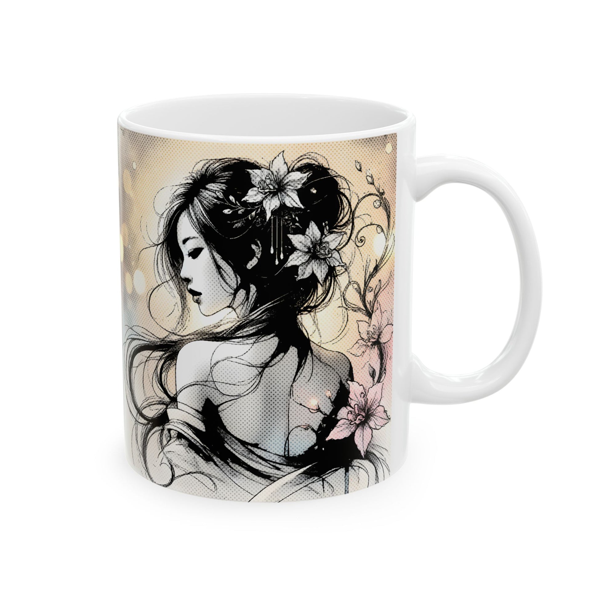 Floral Manga Mug – Elegant Ink Line Art Girl, Soft Japanese-Inspired Flower Scene, Aesthetic Anime Coffee Cup